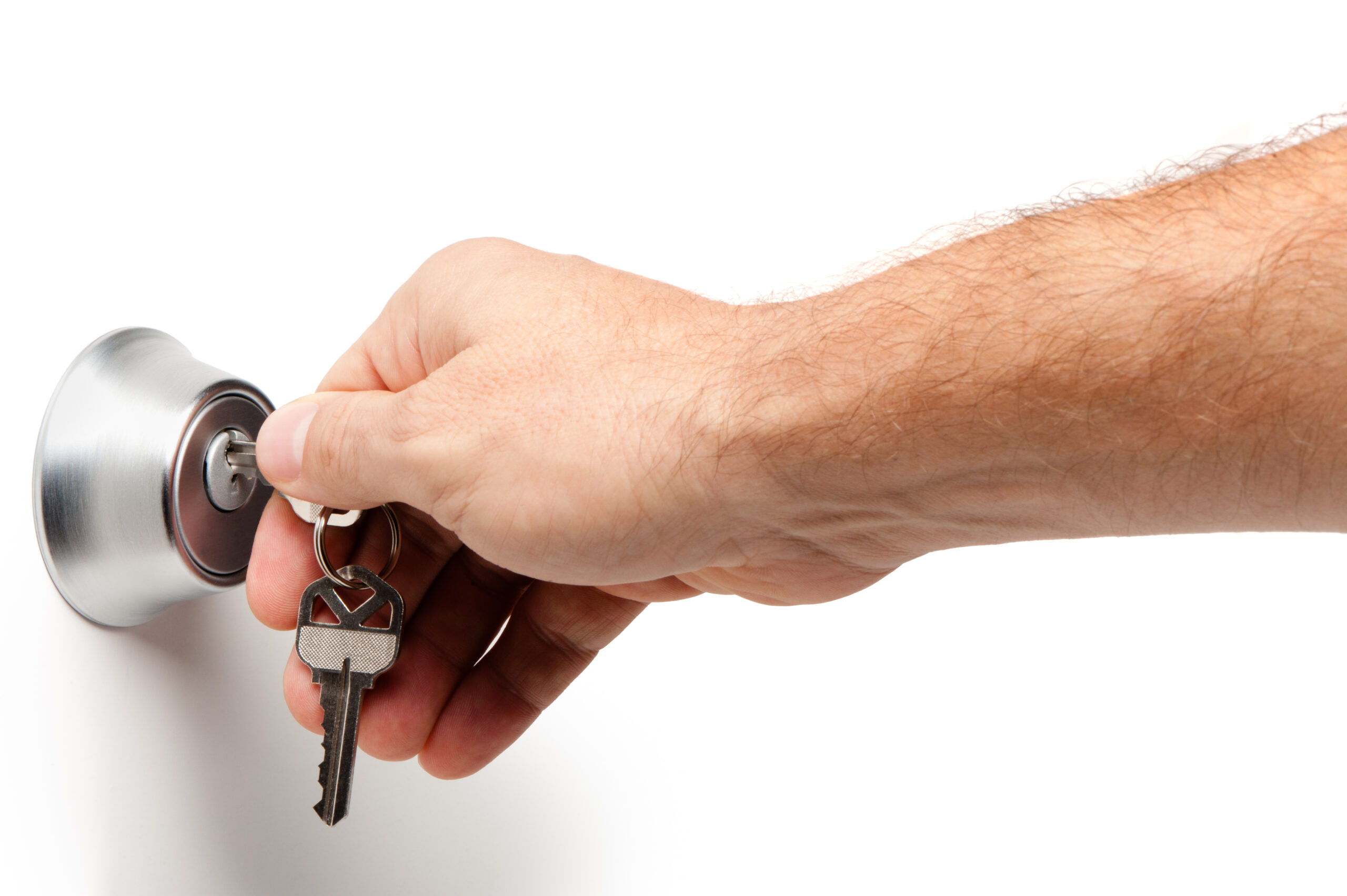 Man,Opening,Deadbolt,Lock,With,Keys,On,White